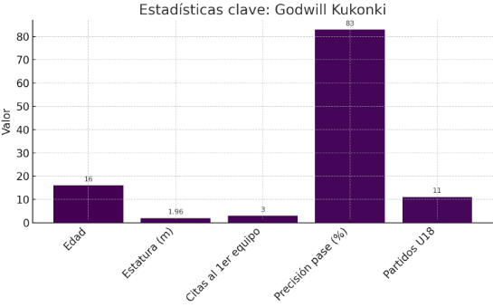 - Godwill Kukonki fue nombrado en el grupo de entrada al primer equipo en Noviembre de 2024, a los 16 años, y es uno de los jugadores más altos de su generación (1,96 m) lo que le da ventaja física.