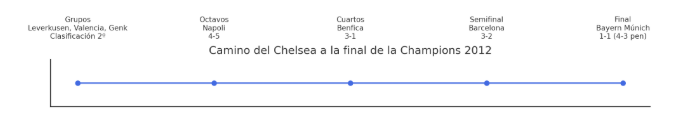 El recorrido hacia Múnich fue cualquier cosa menos sencillo. El Chelsea clasificó segundo en su grupo detrás del Bayer Leverkusen, y en octavos debió remontar un 3‑1 ante el Napoli. En la vuelta, ganó 4‑1 en Stamford Bridge, con goles de Drogba, Terry, Lampard (de penal) y Ivanović en la prórroga. Ese partido fue el verdadero renacer anímico del equipo.