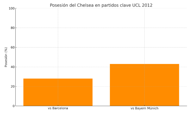 El Chelsea no presionaba alto. Más bien esperaba en bloque bajo o medio, y su prioridad era no desordenarse. El repliegue era inmediato tras pérdida y las líneas se comprimían. En partidos como la semifinal ante el Barcelona o la final contra el Bayern, renunciaron al balón y se concentraron en achicar espacios.