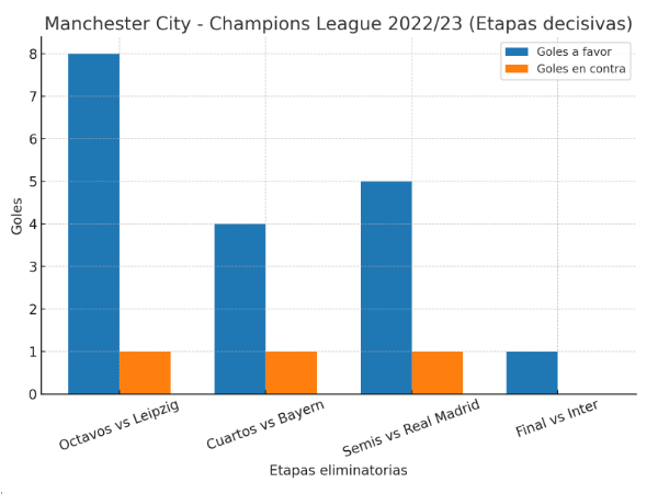 El City firmó una ruta impecable ante rivales de élite: RB Leipzig (8-1 global; 1-1 y 7-0), Bayern Múnich (4-1; 3-0 y 1-1) y Real Madrid (5-1; 1-1 y 4-0). En la final del 10 de junio de 2023 en Estambul, un derechazo de Rodri resolvió el 1-0 ante el Inter y dio la primera Copa de Europa del club. Rodri fue elegido jugador del partido por la UEFA. Con esta victoria, el City completó el triplete (Premier, FA Cup, Champions).