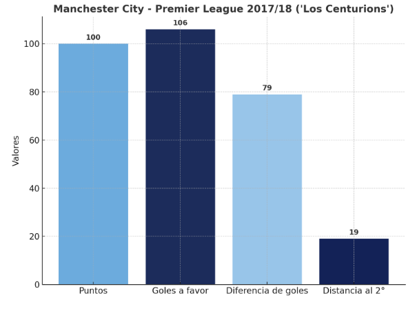 El City terminó con 100 puntos, 106 goles y +79 de diferencia, imponiendo un margen de 19 puntos sobre el segundo. También encadenó 18 triunfos ligueros consecutivos, récord en ese momento. En la última jornada, un 1-0 en Southampton (gol de Gabriel Jesus en descuento) llevó la cifra a tres dígitos y selló la liga más dominante del formato Premier.