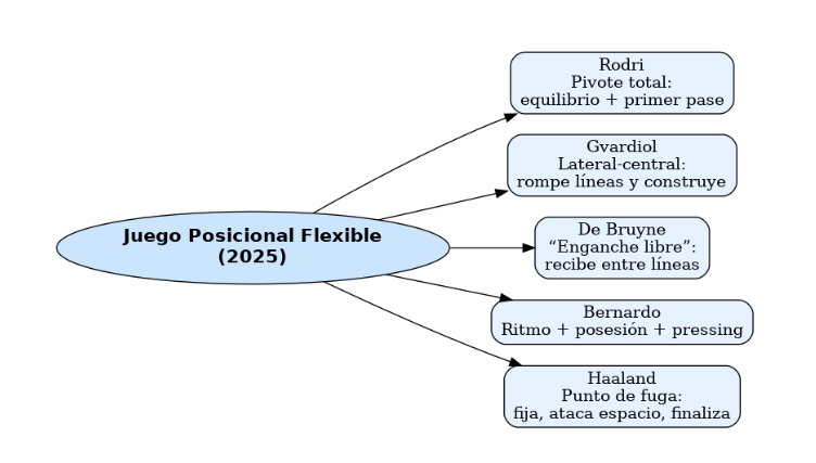 Desde su llegada, Guardiola ha promovido el “positional play” (juego posicional) como clave. Pero para el 2025 ese esquema ha evolucionado: pasan de un clásico 4‑3‑3 a un modelo más híbrido 3‑2‑4‑1 o 3‑1‑4‑2 según el rival.