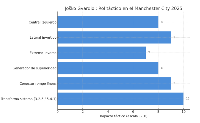 Gvardiol juega de central izquierdo en una línea de tres, pero cuando el City tiene la posesión se convierte en un extremo‑inverso: se proyecta hacia delante, ensancha el campo y genera superioridad. Esto desplaza al rival hacia una zona de riesgo.
