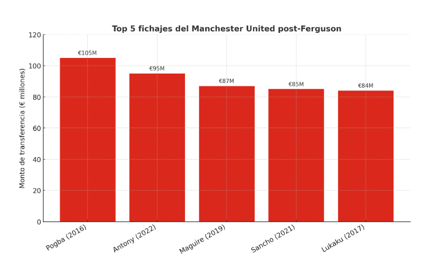 Después del declive inicial, el Manchester United intentó regresar a la élite con lo que parecía más fácil: gastar. Fichajes rimbombantes, cheques en blanco, promesas mediáticas y técnicos con currículum, pero sin tiempo ni contexto. El resultado fue un club que invirtió más que casi todos en Europa… y ganó menos que muchos. Desde 2013 hasta 2024, el United superó los €1.600 millones en compras de jugadores, con un rendimiento deportivo claramente por debajo de esa inversión.