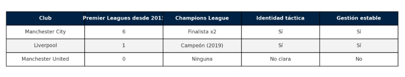 Volver a la cima no significa solo ganar una copa local o meterse en Champions. Implica recuperar consistencia, estilo, respeto continental y un modelo sostenible. Desde 2013, los números muestran un contraste brutal: mientras clubes como City o Liverpool consolidaron ciclos ganadores, el United cambió de entrenador casi cada dos años, invirtió más que nadie y obtuvo menos que muchos.